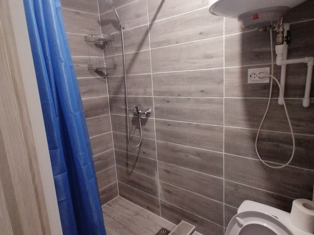 Двухместный номер , две полутораспальный кровати , телевизор , с выходом на улицу , душ и туалет в номере . Полы с подогревом .