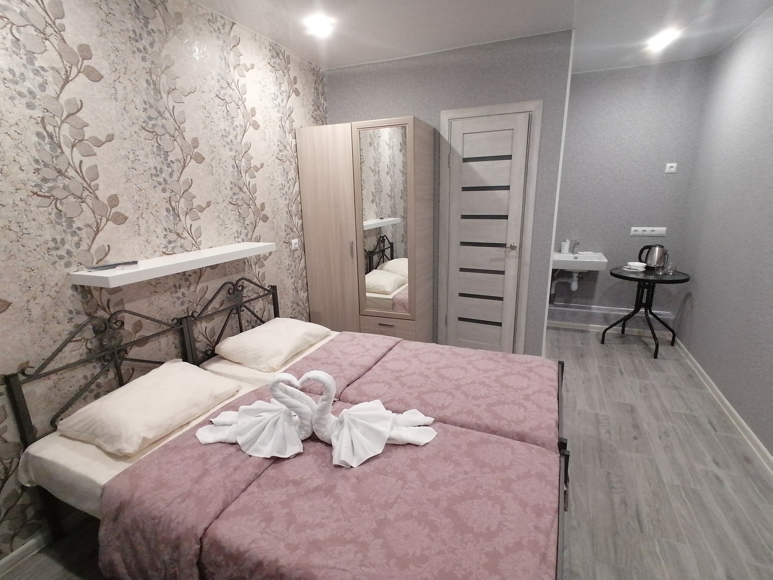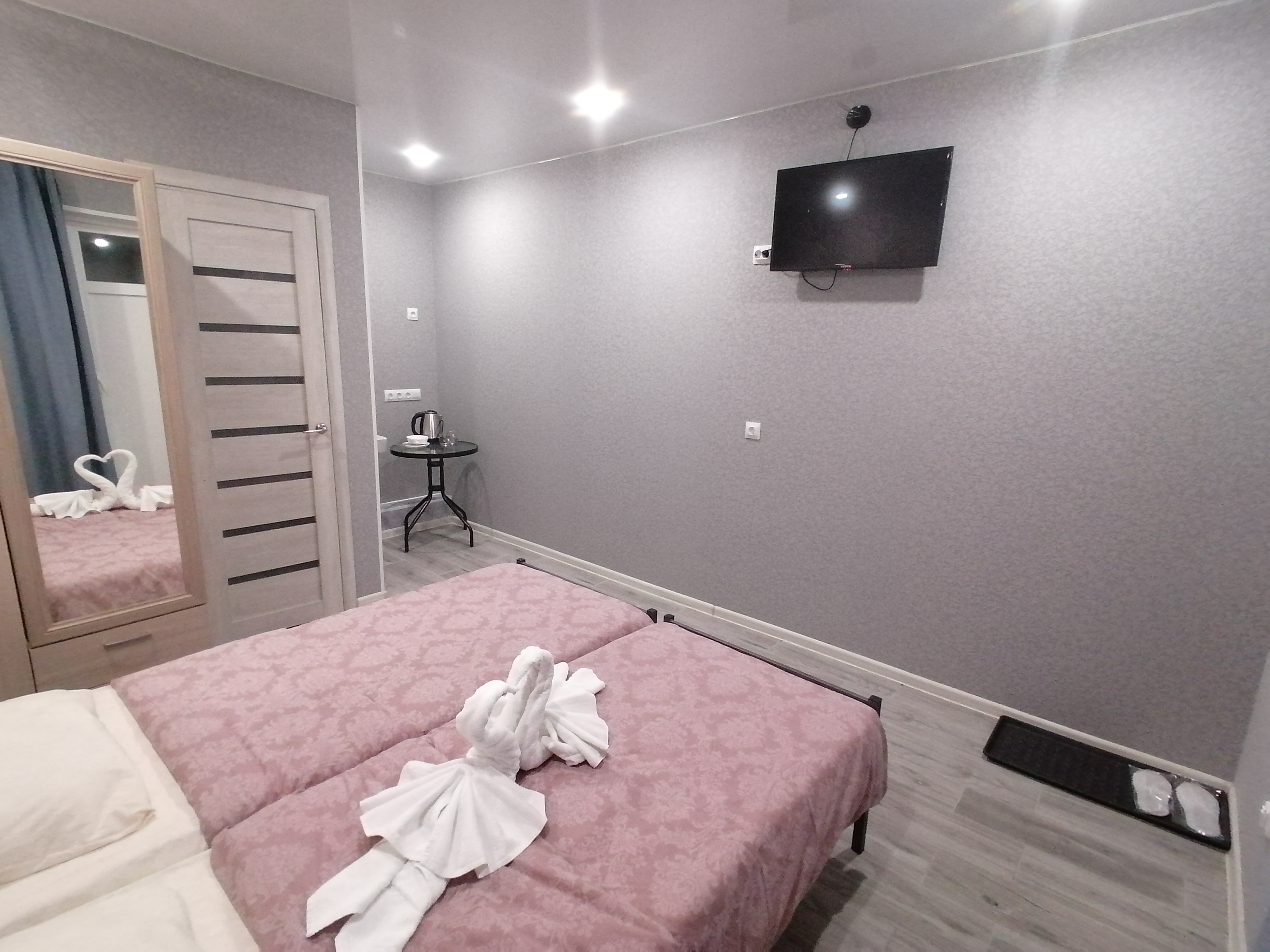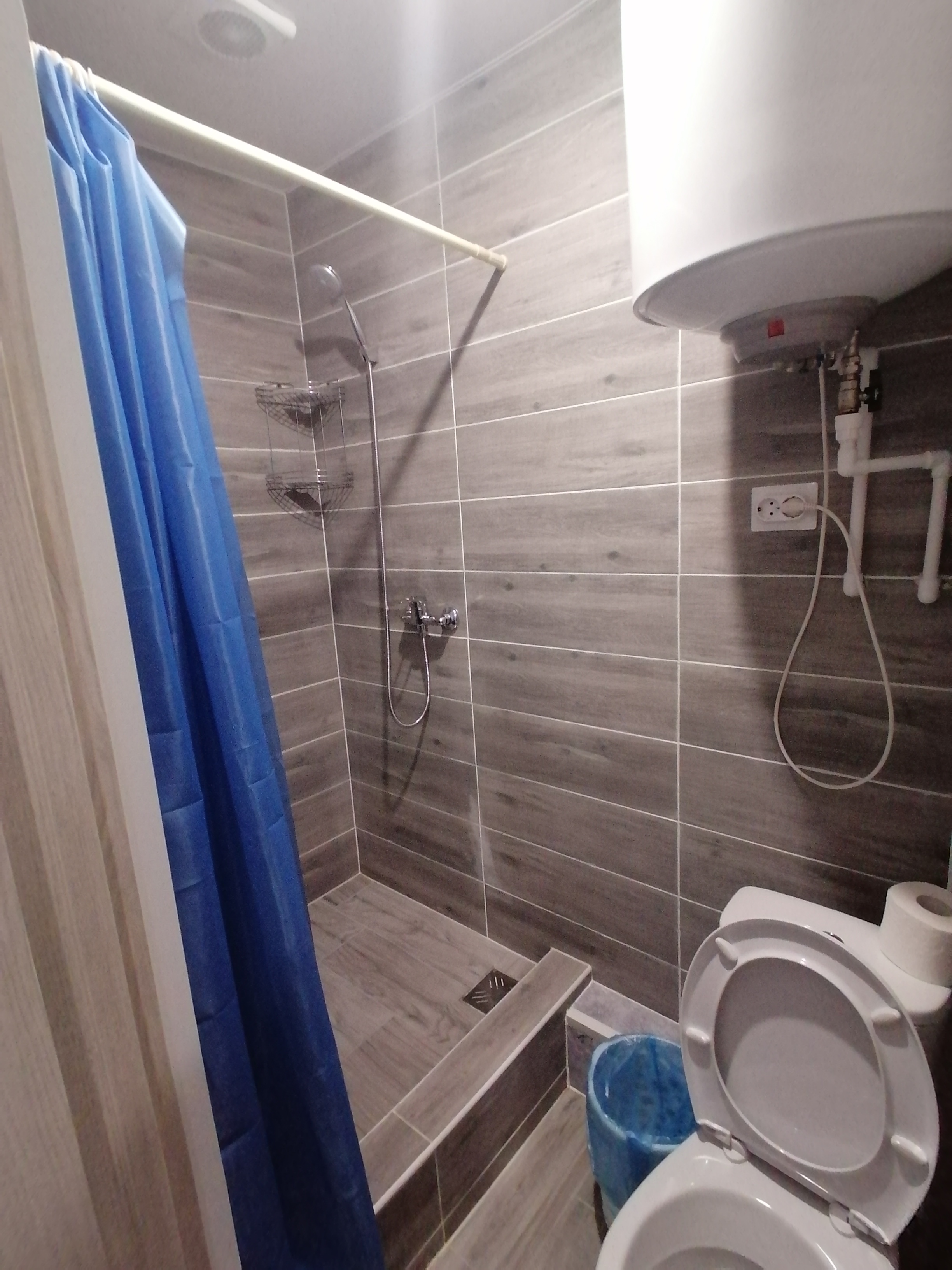 Дом из колибровонного бревна, гостиная с кухней и раскладным диваном, совмещеный сан. узел на первом этаже.
